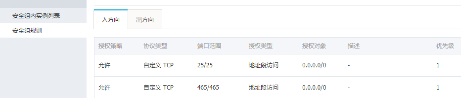 首先添加阿里云本地安全组开放端口465的出入方向,其次服务器的防火墙的465端口也要开启